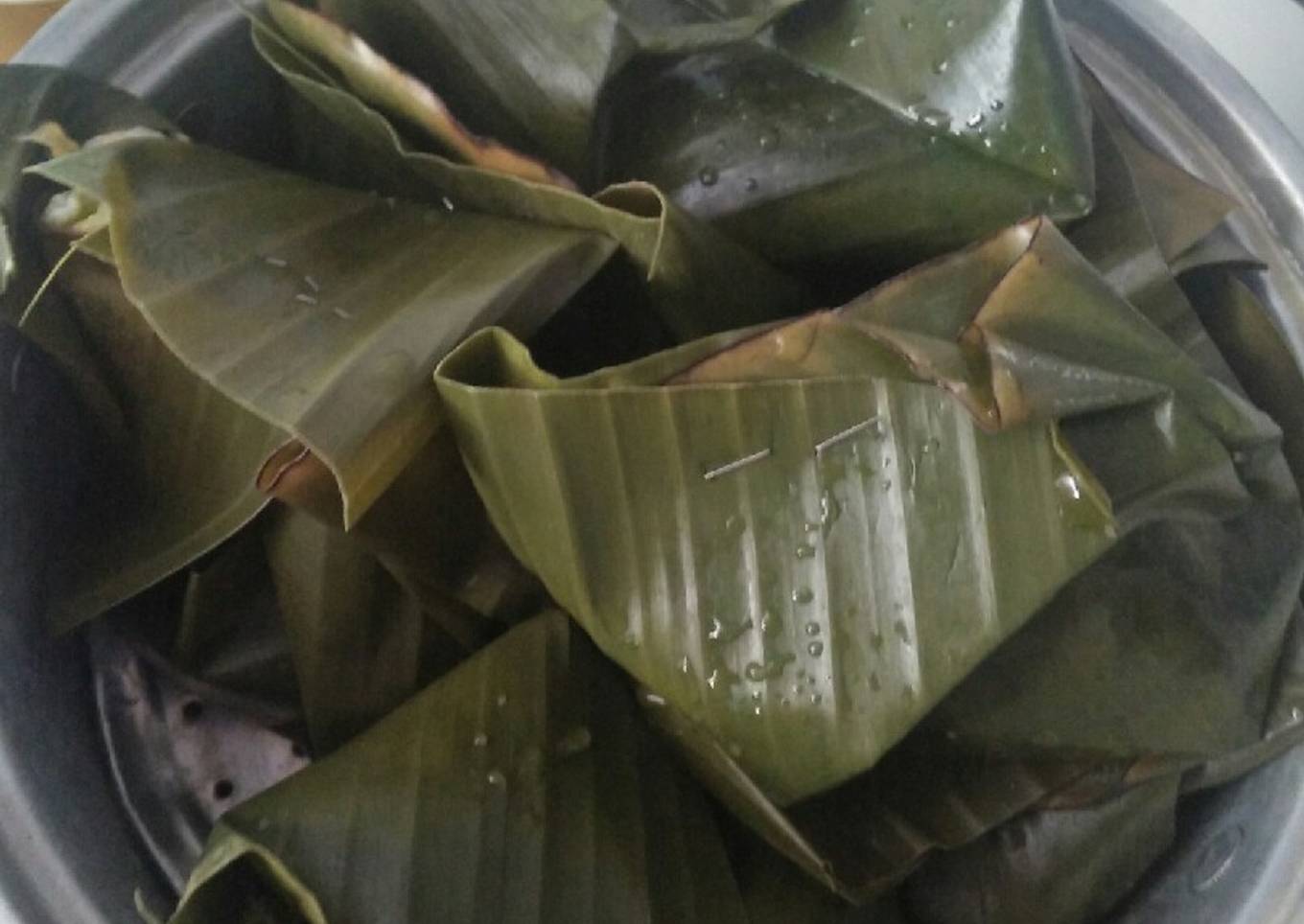 - Beri santan, bahan iris, dan garam, gula, penyedap rasa, tes rasa, lalu masukkan ke daun pisang, kukus 20 menit