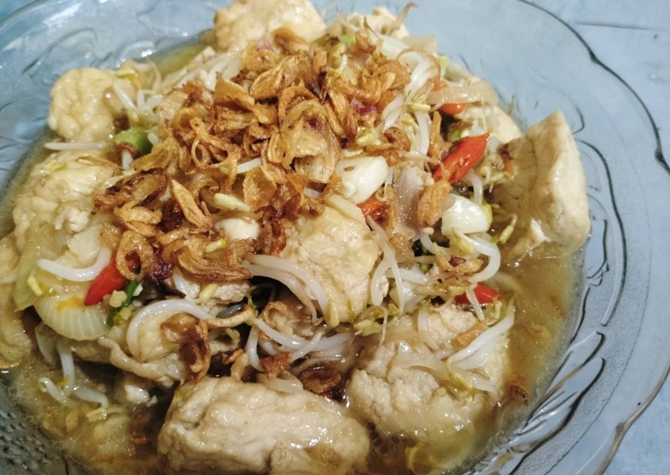 - Iris bawang merah,bawang putih, bombay,cabe lalu tumis hingga kecoklatan, masukan tahu dan beri sedikit air