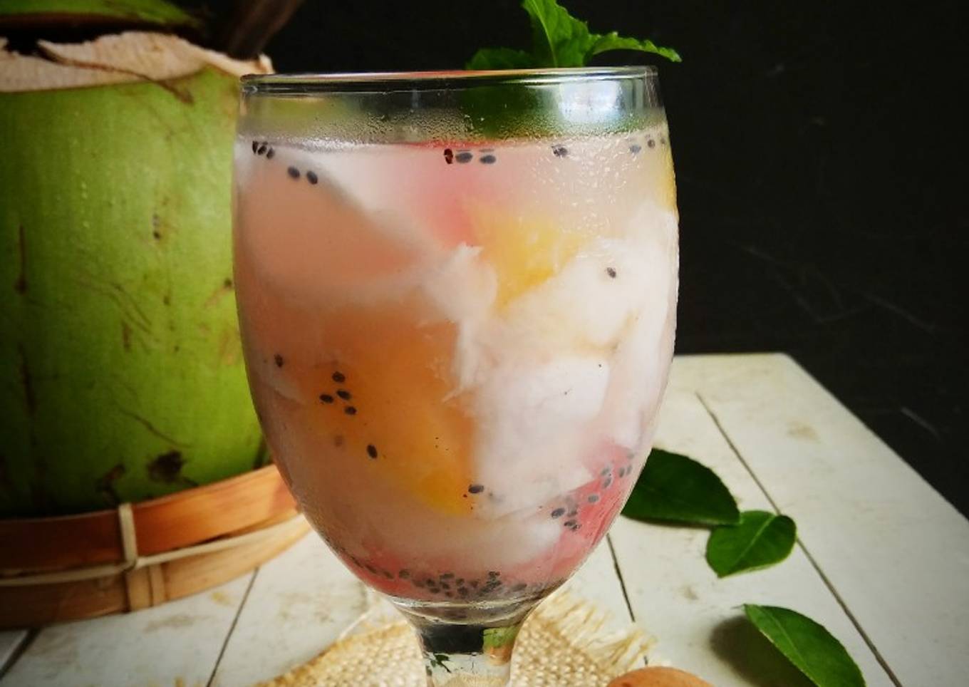 - 1 butir kelapa buka bagian atasnya, gunakan dengan airnya, kemudian daging buah dikerok / serut, tambahkan biji selasih, dan Sirup gula aduk rata.