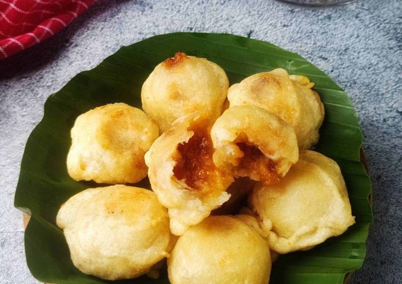 - Pipihkan adonan lalu masukan bahan isi,bulatkan jika dirasa lengket taburi tebung atau olesi sedikit minyak di telapak tangan